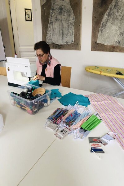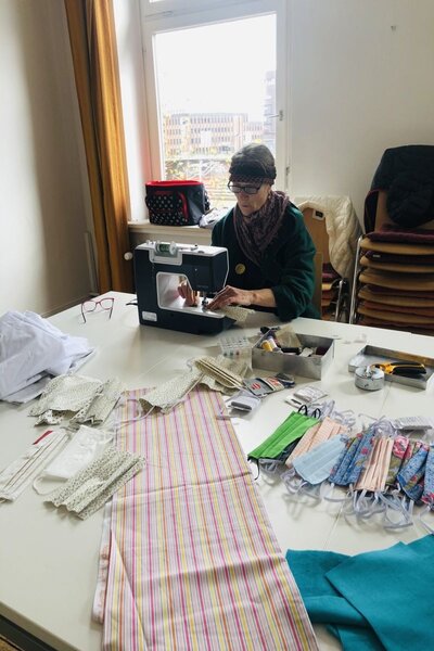 Als Notfallmaßnahme gegen eine Verbreitung des Corona-Virus nähen die Frauen ehrenamtlich bunt gemusterte Behelfsmasken und spenden diese anschließend an Bedürftige.